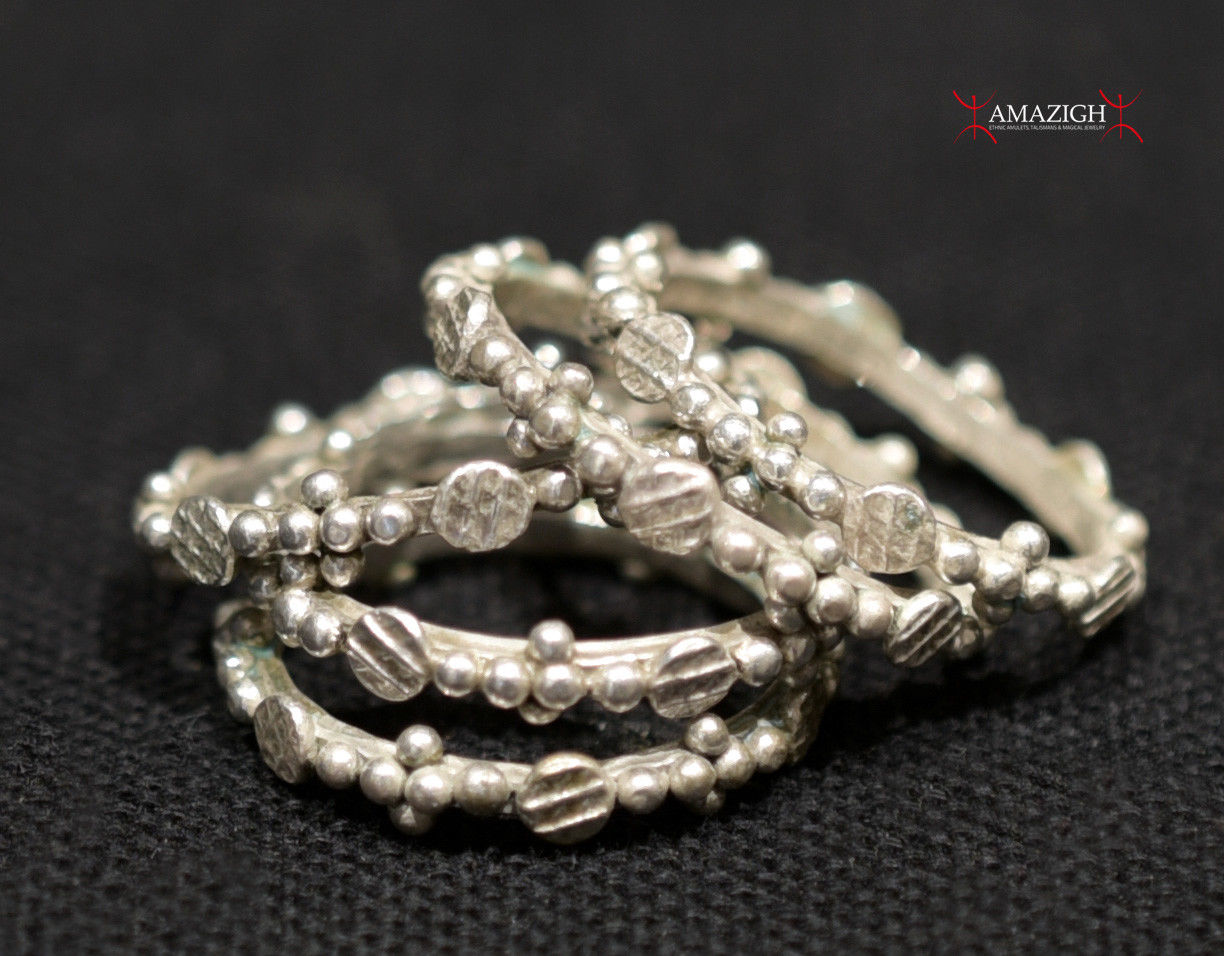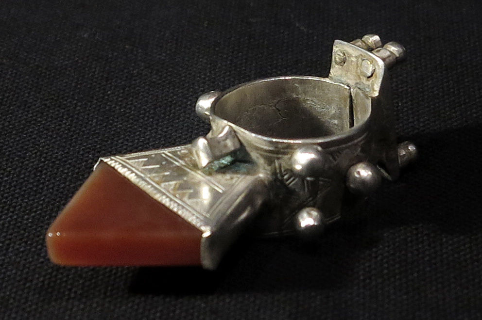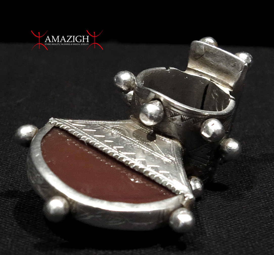Early to mid 20th century. Silver, enamel, red glass. cm. 2,4 high (0.94"); inner diameter cm. 1,9 (0.75”); US size 6.75. Gr. 6,3 (0.22 oz). Berbers are the indigenous ethnic group of North Africa. They are continuously distributed from the Atlantic to the Siwa oasis in Egypt, and from the Mediterranean...