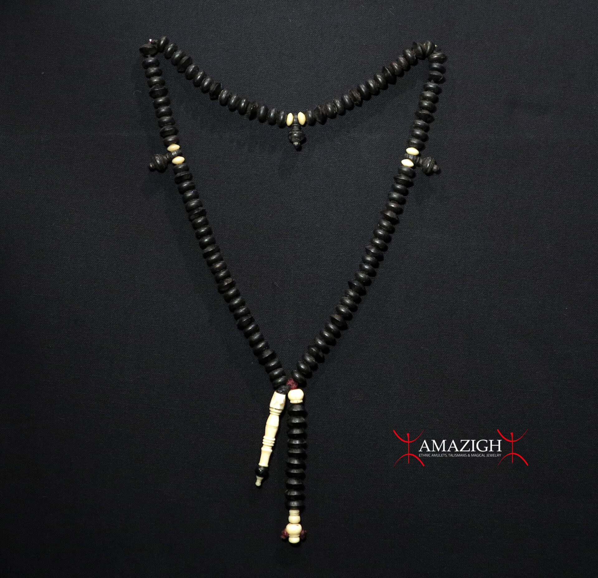 Ebony beads and camel bone elements. Cm. 47 in length; beads diameter approx. from cm. 1,0 to cm. 1,4; grams 63,8.