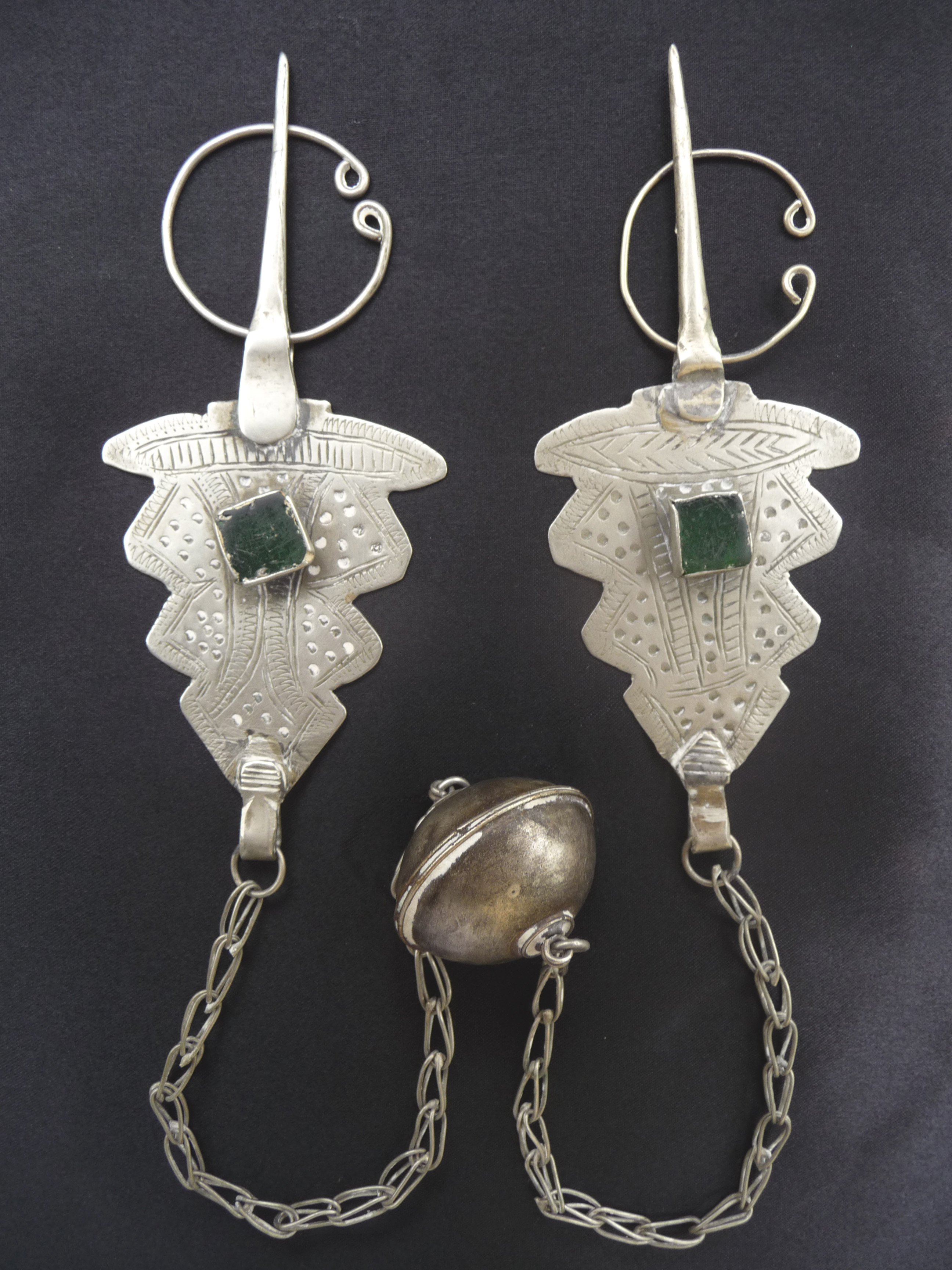 Early 20th century. Silver alloy, green glass gr. 66,7 (2.35 oz). Each fibula measures cm. 13,0 (5.11”) high x cm. 5,2 (2.04”) width. Overall, with the chain, the piece is cm. 63,0 long (24.80 Inches). Essential feminine embellishment, the tizerzai are taken in pairs to close the coat. Their weight, size and the fineness of the workmanship indicate the social status of the woman who wears them. Berbers are the indigenous ethnic group of North Africa. They are continuously distributed from the Atlantic to the Siwa oasis in Egypt, and from the Mediterranean to the Niger River.The name Berber appeared for the first time after the end of the Roman Empire. Many Berbers call themselves some variant of the word imazighen (singular: Amazigh), possibly meaning “free people” or “free and noble men”. Today, most Berber-speaking people live in Morocco and Algeria. Sold