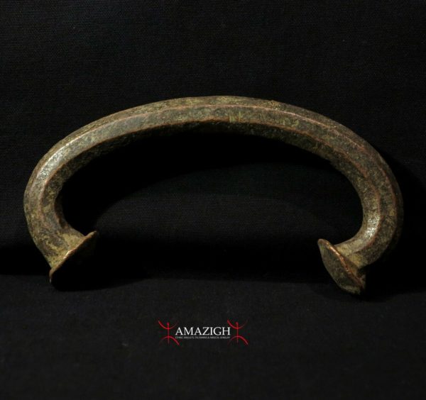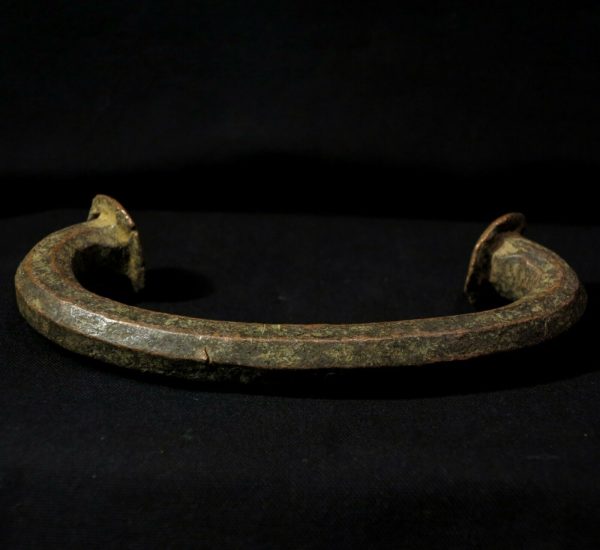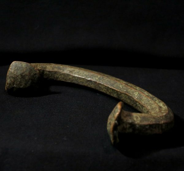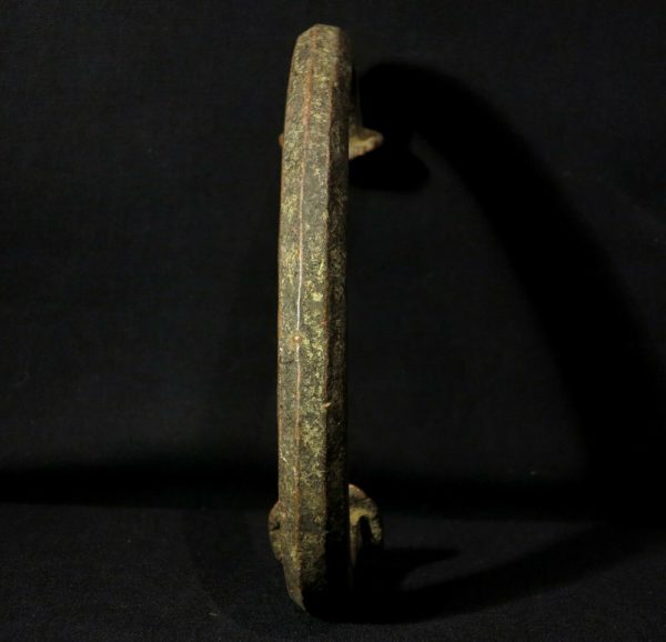 Early 20th century. Copper bar, lost wax fusion, curved disc-shaped ends. The piece is 18,7 width x 9,0 high (7.36″ x 3.54″). Gr. 846,0 (29.84 oz.).