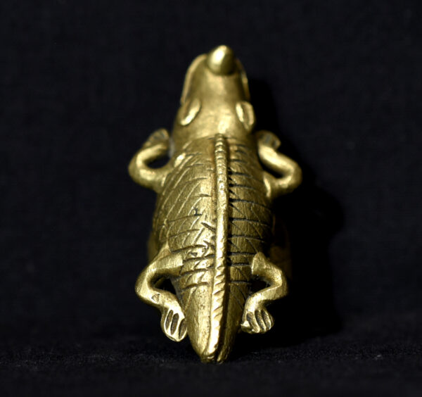 Ashanti metalwork—particularly in brass and gold—often incorporates animal imagery associated with strength, wisdom, authority, and spiritual protection. The crocodile, frequently represented in Ashanti art, is a symbol of adaptability, power, and the connection between the physical and spiritual worlds, reflecting the importance of nature and proverbs in Ashanti culture.