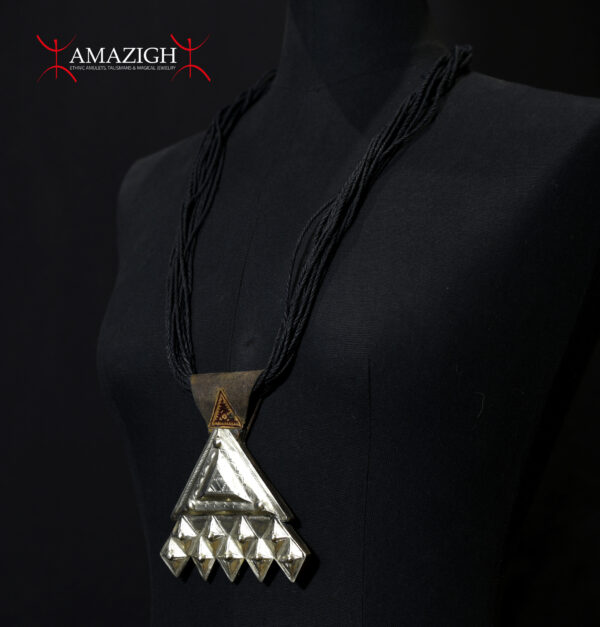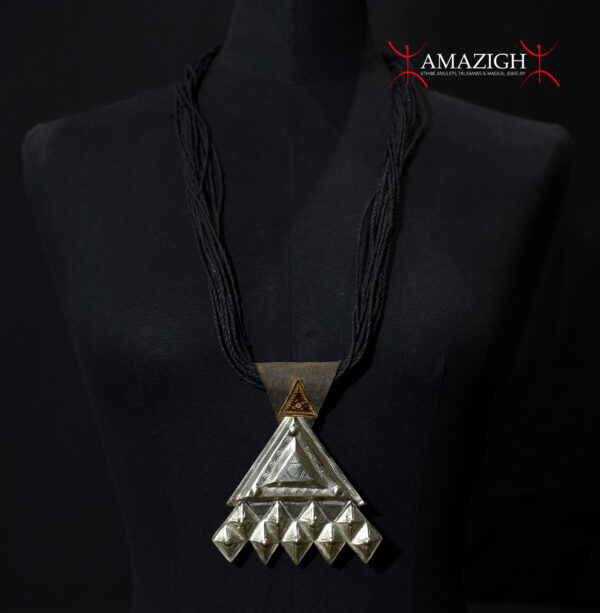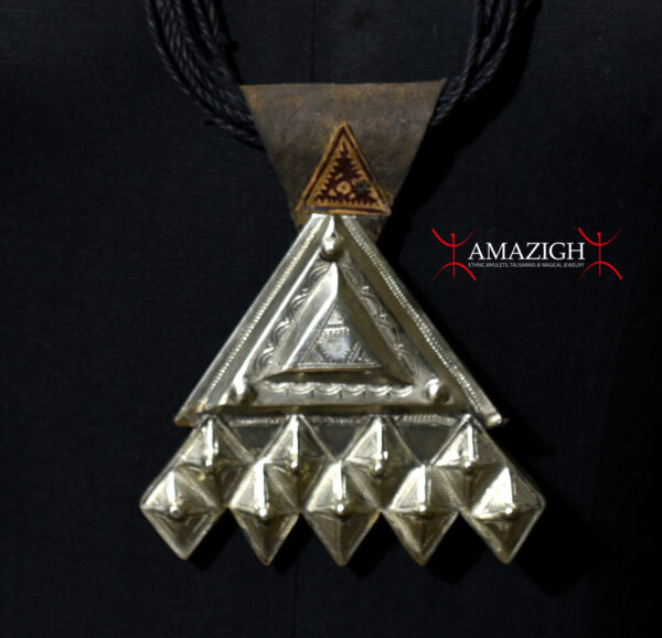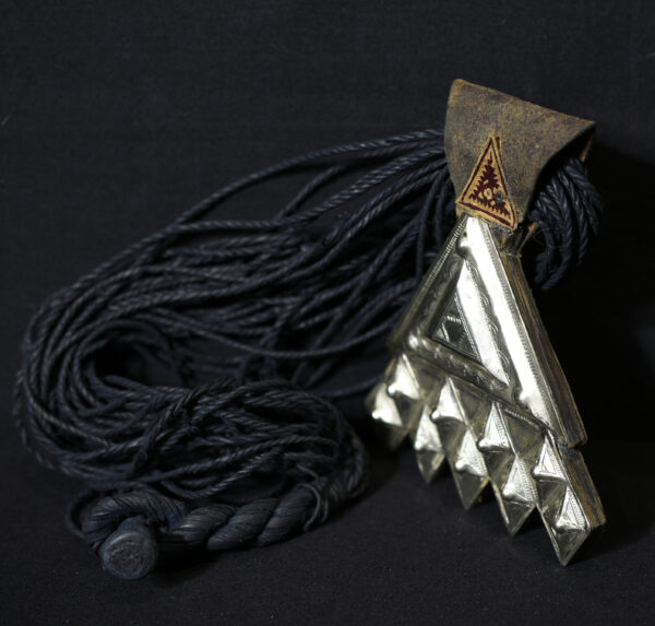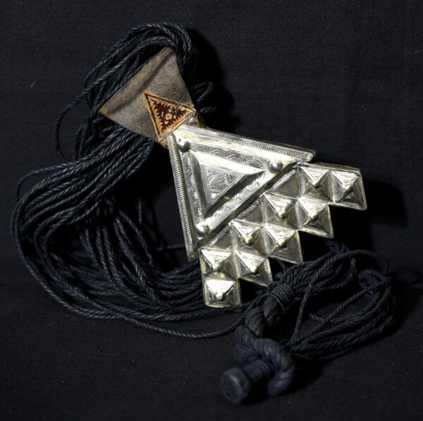 This particular Khomissar was conceived as a talisman associated with pregnancy protection and fertility. The central triangular motif is commonly interpreted as a reference to Tanit, a Berber–Phoenician goddess linked to fertility and the generative forces of nature, while the nine small pyramidal elements at the base of the triangle are traditionally understood as symbolizing the nine lunar months of human gestation.
