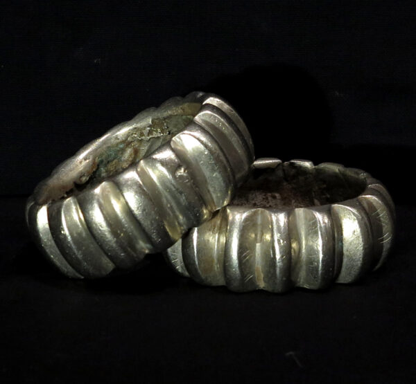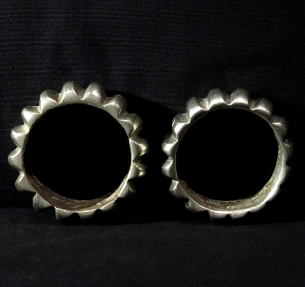 Early to mid 20th century. Tribal Metal gr. 2.095,0 (79,9 oz.). The bracelets with the tips are cm. 15,0 width x cm. 4,5 high (5.91″ x 1.77″); inner diameter cm. 6,7 (2.64″). The others bracelets are cm. 8,7 width x cm. 3,0 high (3.43″ x 1.18″); inner diameter cm. 6,6 (2.60″).