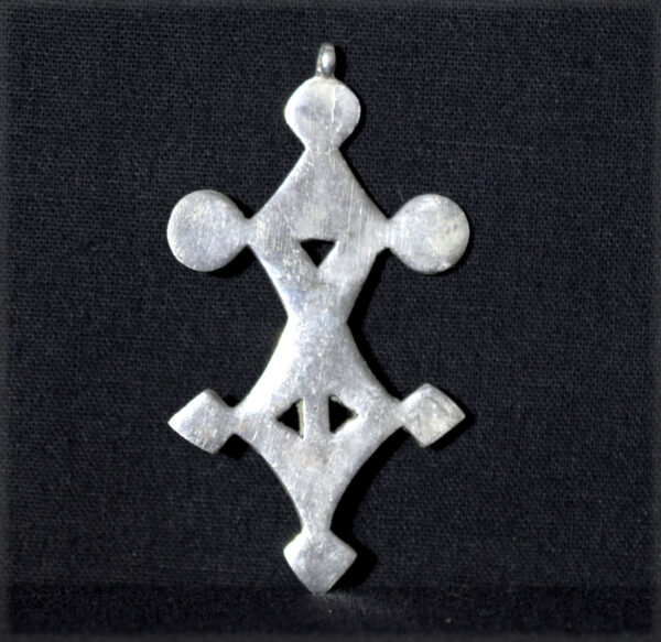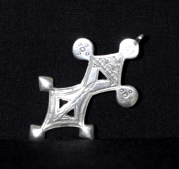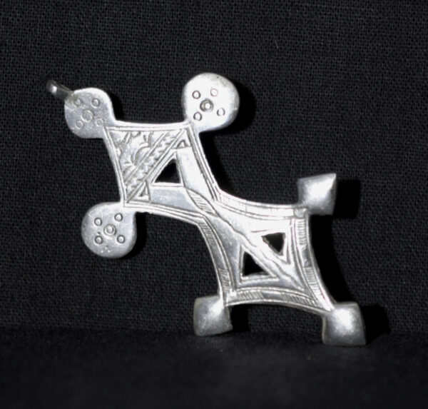 The same typical turban – the litham – that completely covers the face of the Tuareg except the eyes, has the primary function of protecting the “gates of the soul” (mouth and nostrils) from the Jinn. But the main instruments of protection are the amulets and talismans. Every Tuareg, man or woman, old or young child , has an amulet or a talisman: leather ( the gri-gri ) or silver (the khomissar , the tcherot , the herz), often contain magic formulas, powders of animal and / or vegetable or verses from the Koran. Very often one stands out among these talismans: the upper part is a ring and the lower part is a lozenge-shaped with small tips: this is the Tuareg Cross.