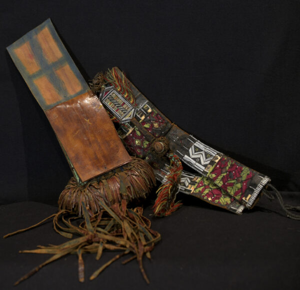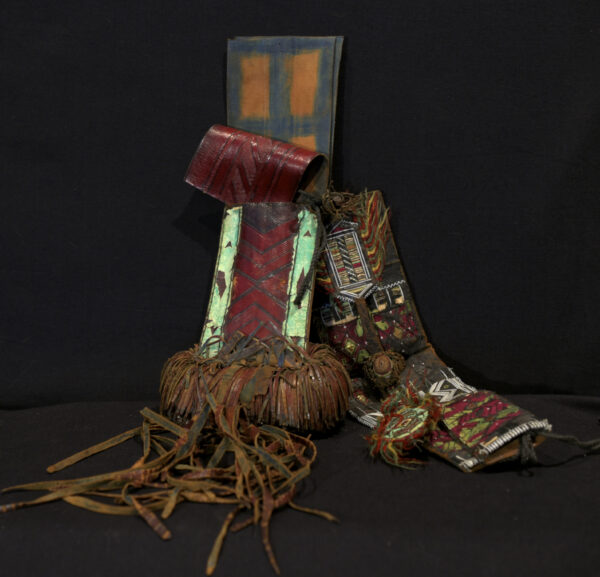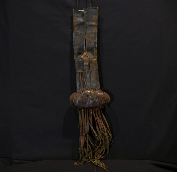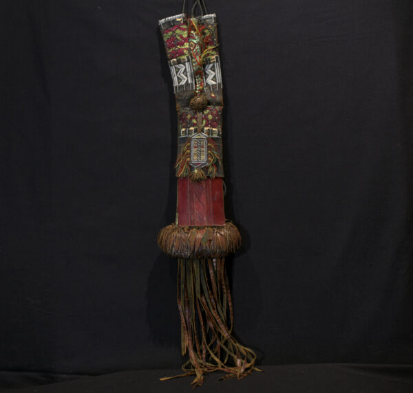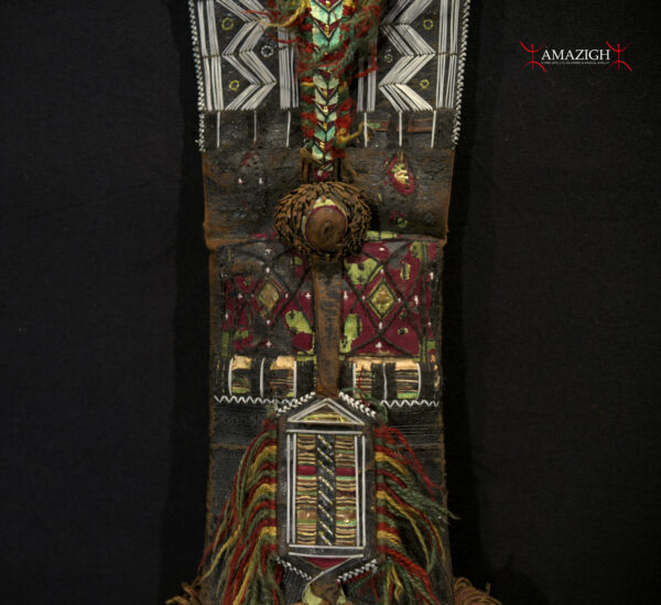 Leather, wool. Without fringes, cm. 32,0 high x cm. 7,3 width (12.60″ x 2.87″). With fringes approx. cm. 55,0 high (21.65″).