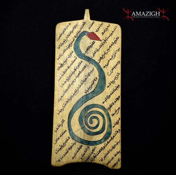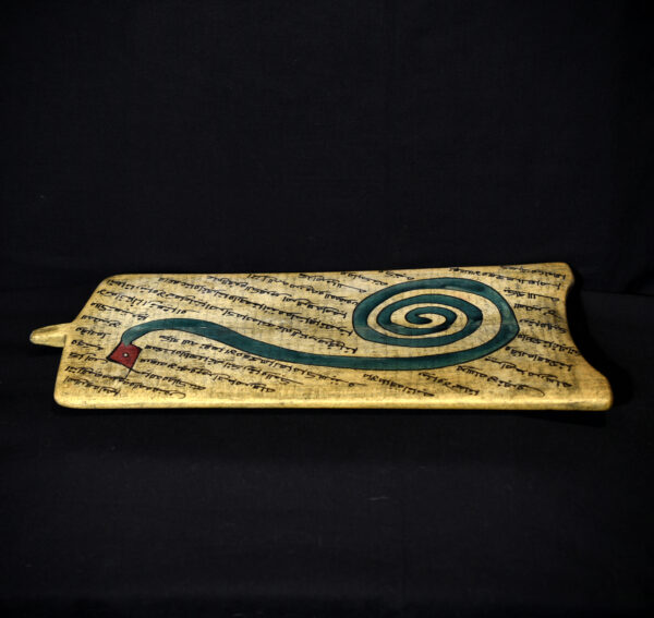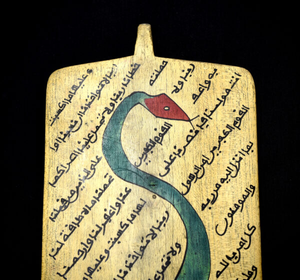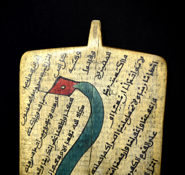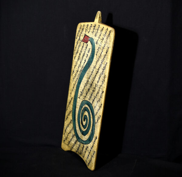 Rectangular wooden allo (Koranic writing board) used in Islamic education for the teaching and memorization of the Qur’an. The front surface is densely covered with handwritten Arabic verses, traditionally inscribed using black ink derived from natural pigments. Superimposed on the sacred text is a striking painted motif depicting a stylized serpent with an elongated, sinuous body forming a spiral, rendered in turquoise blue with a contrasting red head.