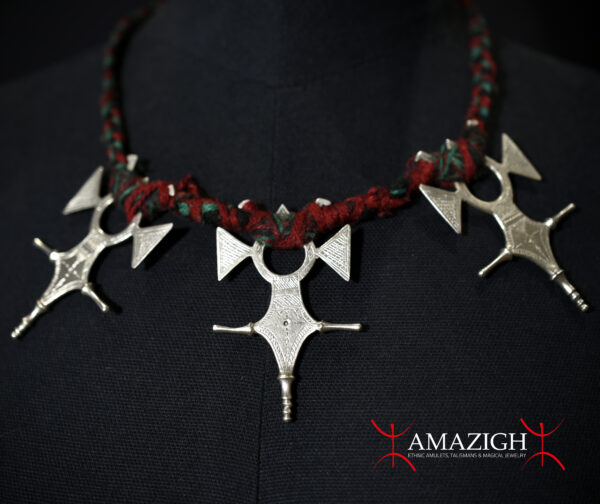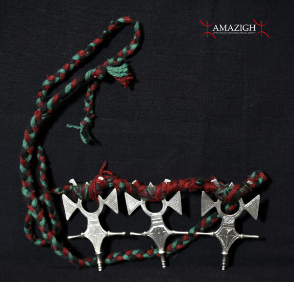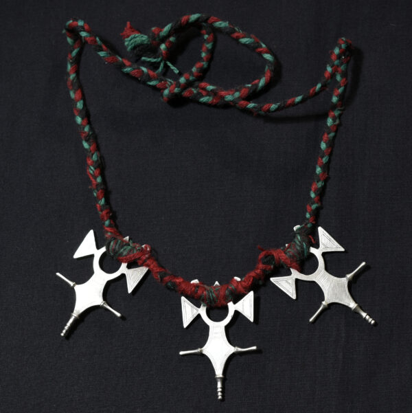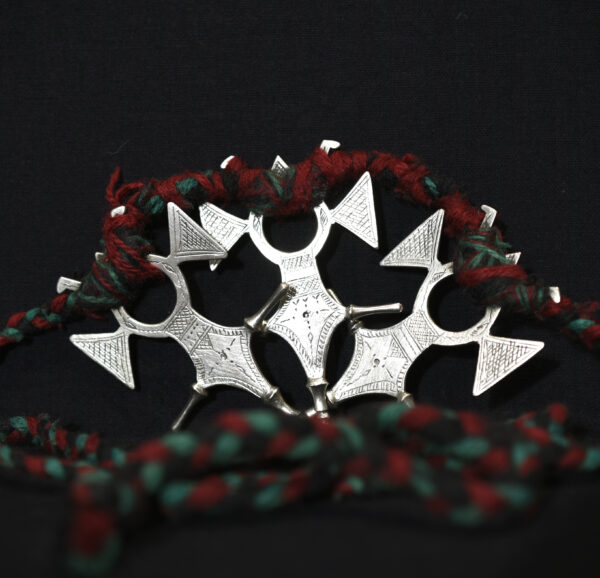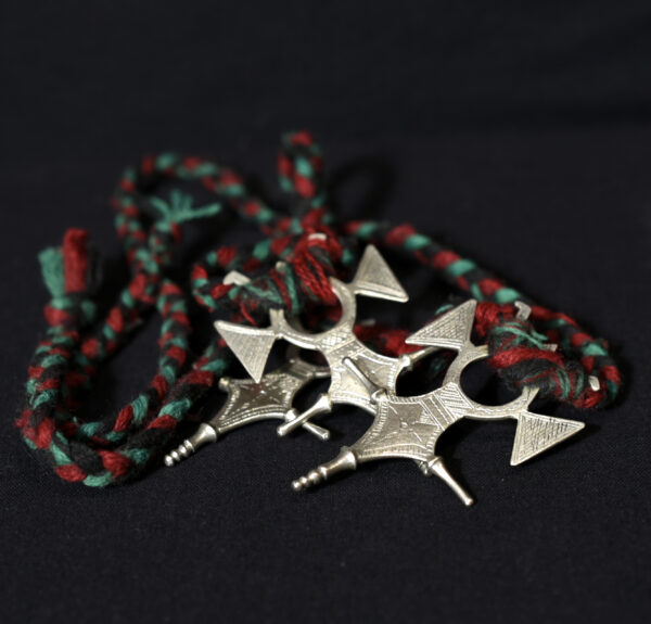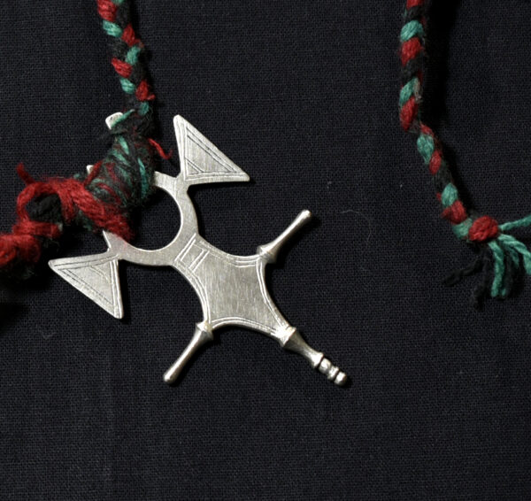 The same typical turban – the litham – that completely covers the face of the Tuareg except the eyes, has the primary function of protecting the “gates of the soul” (mouth and nostrils) from the Jinn. But the main instruments of protection are the amulets and talismans. Every Tuareg, man or woman, old or young child , has an amulet or a talisman: leather ( the gri-gri ) or silver (the khomissar , the tcherot , the herz), often contain magic formulas, powders of animal and / or vegetable or verses from the Koran. Very often one stands out among these talismans: the upper part is a ring and the lower part is a lozenge-shaped with small tips: this is the Tuareg Cross.