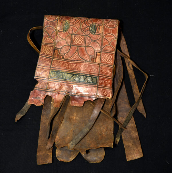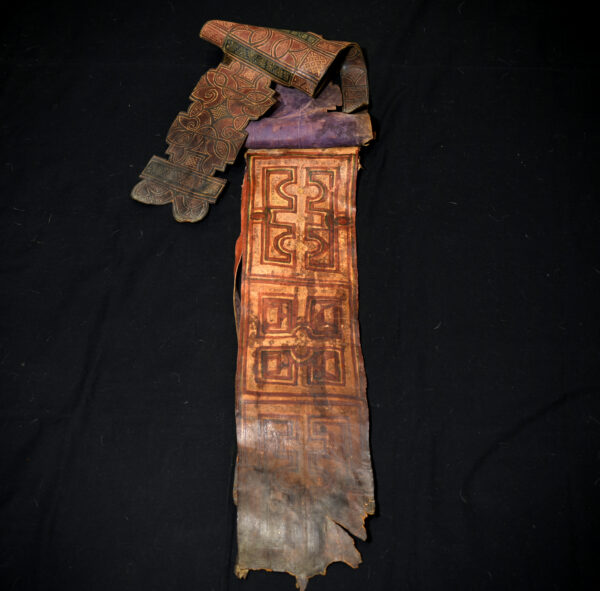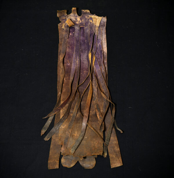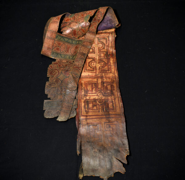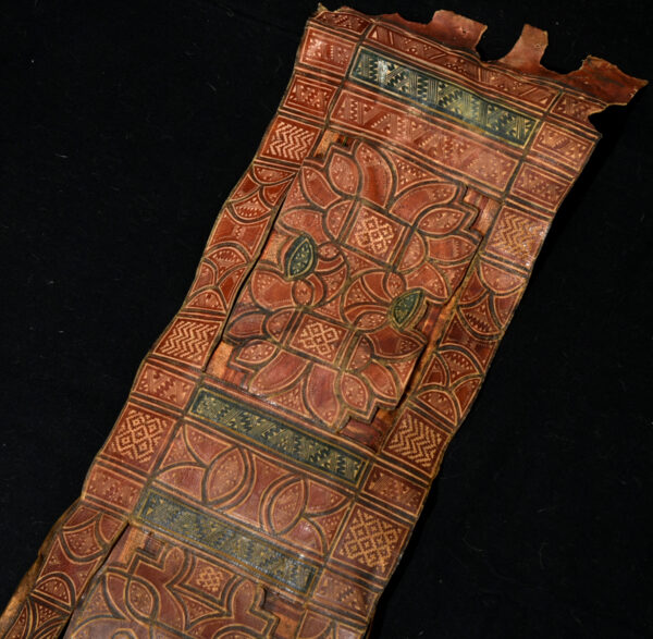 Engraved and colored leather. Approx. 77.0 cm (H) × 23.0 cm (W).