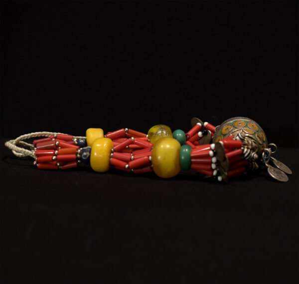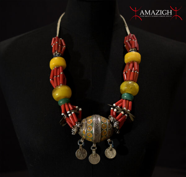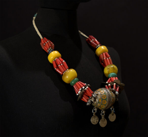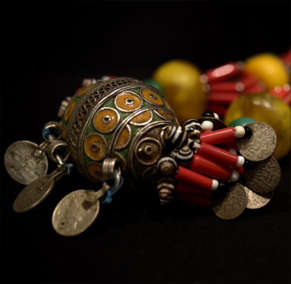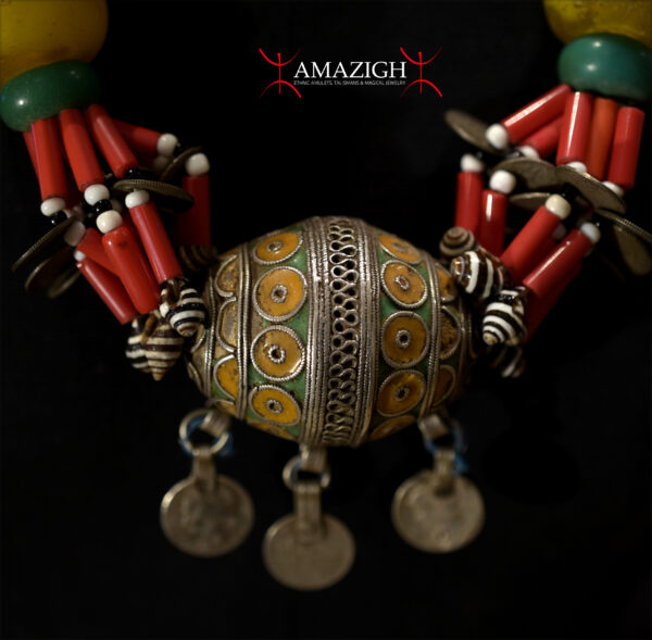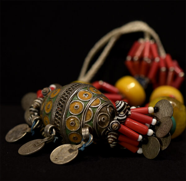 The large central egg-shaped pendant (TAGMOUT) is enamelled silver, 4 large resin beads, old Moroccan silver coins, old US and French metal coins, glass beads. The necklace is cm. 68,0 in length (26.77″). gr. 261,6 (9.23 oz.).