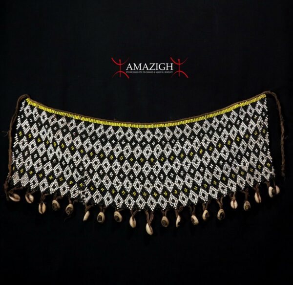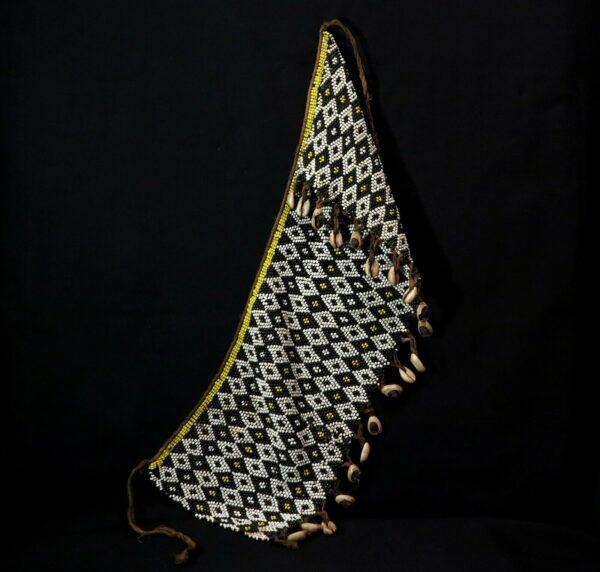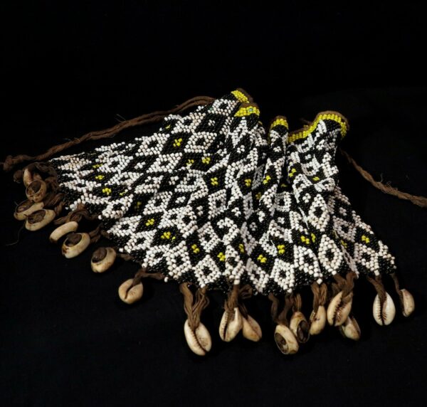 1960′. Glass beads, cowries shells. Approx. cm. 17,0 high x cm. 50,0 width (6.69″ x 19.69”); grams 334,7 (11.81 oz).
