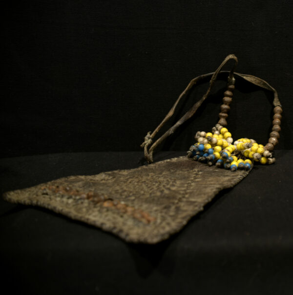 1960′. Leather, glass beads, iron beads. Approx. cm. 20,7 high x cm. 17,4 width (8.15″ x 6.85”); grams 172,2 (6.07 oz).