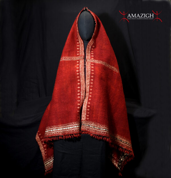 This Tunisian Ajar is a traditional Berber shoulder shawl, hand‑woven in wool and characterized by its warm deep red hue — a culturally significant color associated with strength and femininity in Tunisian textile traditions.